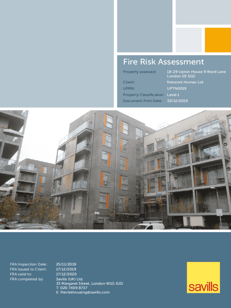 Fire Risk Assessment Property assessed:1829 Upton House 9 Ward Lane London E9 5QZClient:Network Homes Turn:UPTN0019Property Classification: Level 1 Document Print Date:FRA Inspection Date: FRA Issued