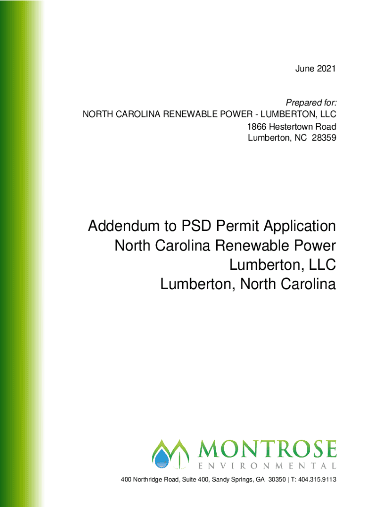 June 2021Prepared for: NORTH CAROLINA RENEWABLE POWER LUMBERTON, LLC 1866 Hester town Road Lumberton, NC 28359Addendum to PSD Permit Application North Carolina Renewable Power Lumberton, LLC Lumberton,