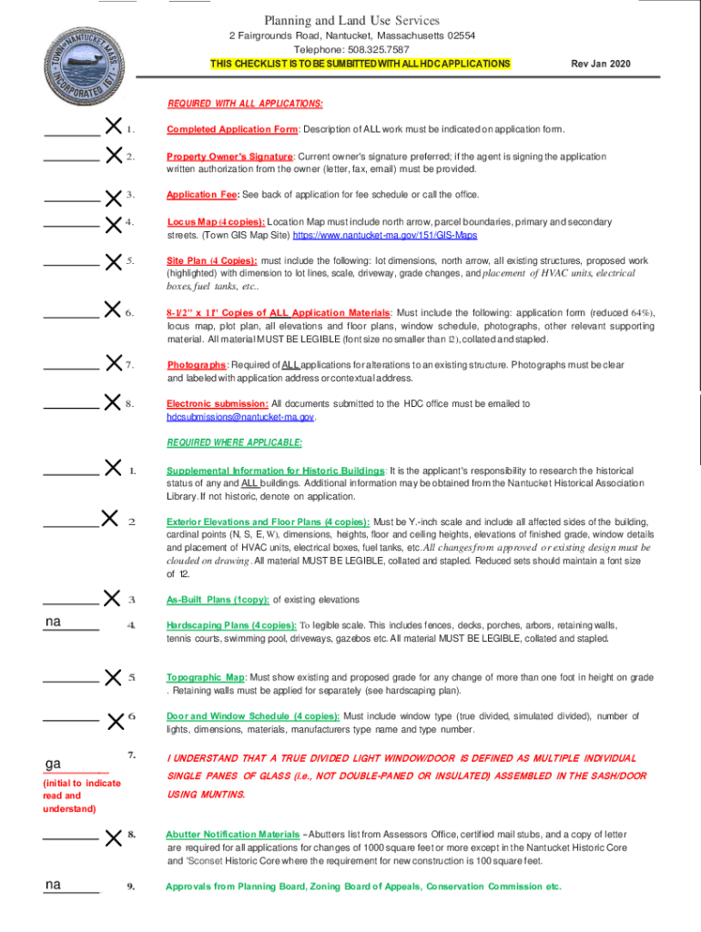 Planning and Land Use Services 2 Fairgrounds Road, Nantucket, Massachusetts 02554 Telephone: 508.325.7587THIS CHECKLIST IS TO BE SUBMITTED WITH ALL HD APPLICATIONS Rev Jan 2020REQUIRED WITH ALL APPLICATIONS: