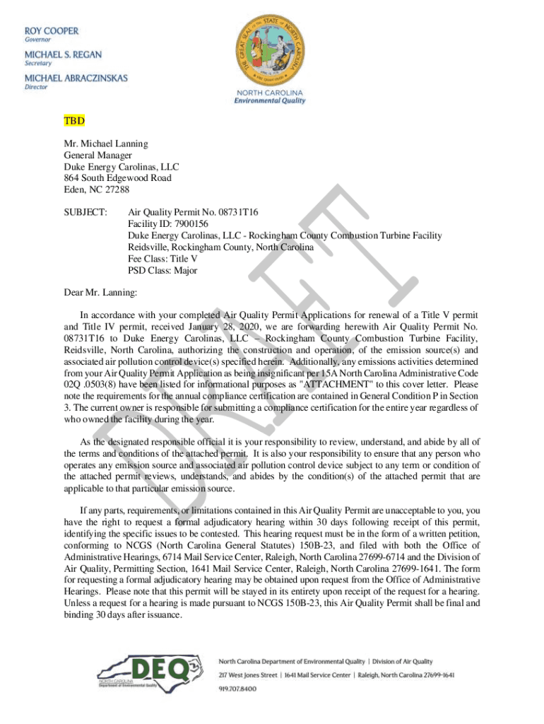 TBD Mr. Michael Landing General Manager Duke Energy Carolina's, LLC 864 South Edgewood Road Eden, NC 27288 SUBJECT:Air Quality Permit No. 08731T16 Facility ID: 7900156 Duke Energy Carolina's, LLC