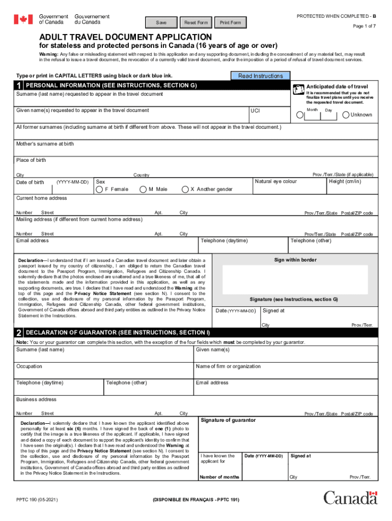 Severest FormPROTECTED WHEN COMPLETED Print Form Page 1 of 7ADULT TRAVEL DOCUMENT APPLICATION for stateless and protected persons in Canada (16 years of age or over) Warning: Any false or misleading