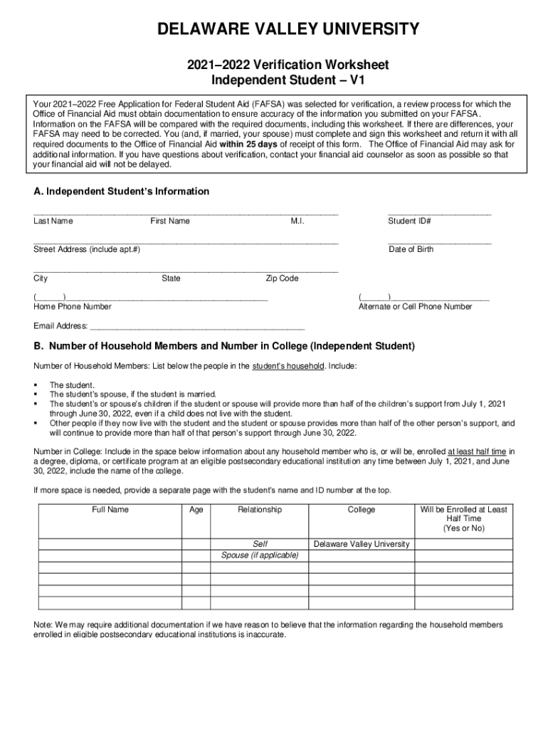 DELAWARE VALLEY UNIVERSITY 20212022 Verification Worksheet Independent Student V1 Your 20212022 Free Application for Federal Student Aid (FAFSA) was selected for verification, a review process for