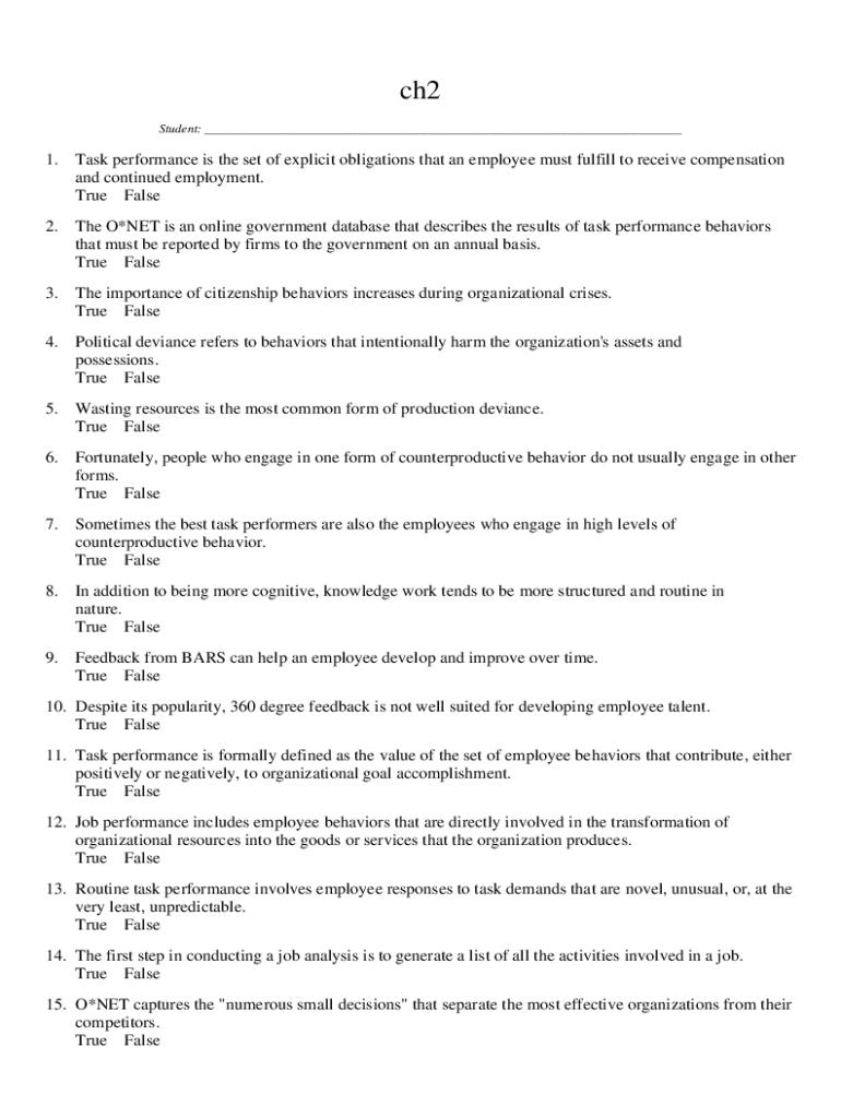 Ch2 Student: ___1. Task performance is the set of explicit obligations that an employee must fulfill to receive compensation and continued employment. True False2. The O×NET is an online government