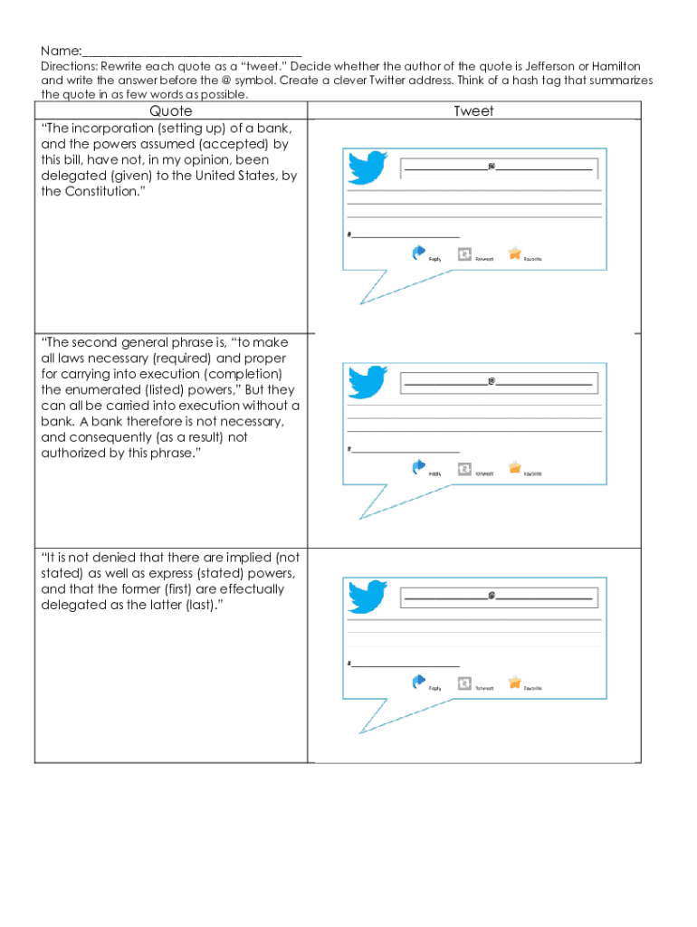 Name:___ Directions: Rewrite each quote as a tweet. Decide whether the author of the quote is Jefferson or Hamilton and write the answer before the @ symbol. Create a clever Twitter address. Think