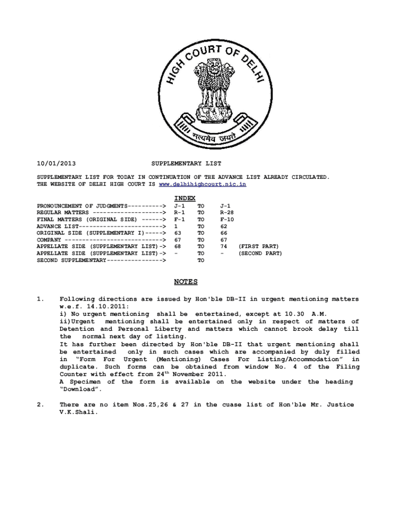 10/01/2013SUPPLEMENTARY LISTSUPPLEMENTARY LIST FOR TODAY IN CONTINUATION OF THE ADVANCE LIST ALREADY CIRCULATED. THE WEBSITE OF DELHI HIGH COURT IS www.delhihighcourt.nic.inINDEX PRONOUNCEMENT OF