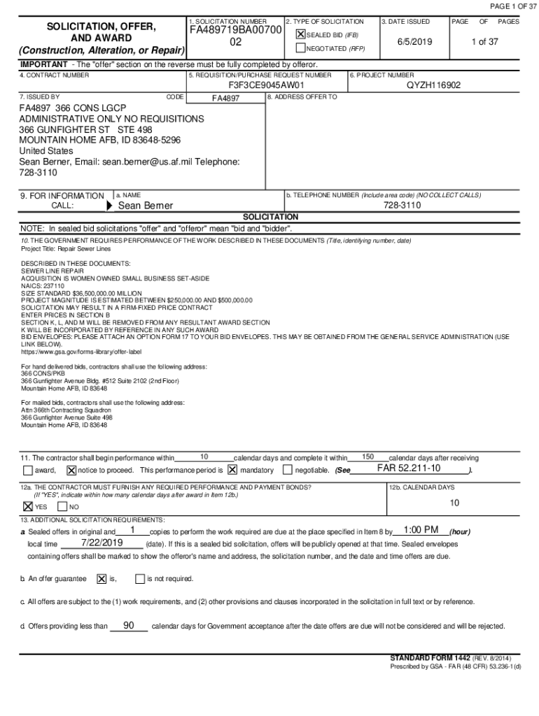 PAGE 1 OF 37 1. SOLICITATION NUMBERSOLICITATION, OFFER, FA489719BA00700 AND AWARD 02 (Construction, Alteration, or Repair)2. TYPE OF SOLICITATION3. DATE ISSUEDSEALED BID (IF)PAGE6/5/2019NEGOTIATED