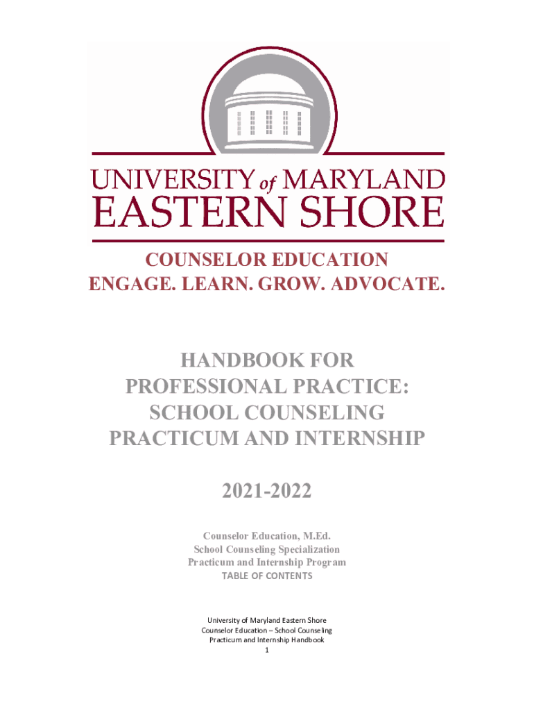 COUNSELOR EDUCATION ENGAGE. LEARN. GROW. ADVOCATE.HANDBOOK FOR PROFESSIONAL PRACTICE: SCHOOL COUNSELING PRACTICUM AND INTERNSHIP 20212022 Counselor Education, M. Ed. School Counseling Specialization