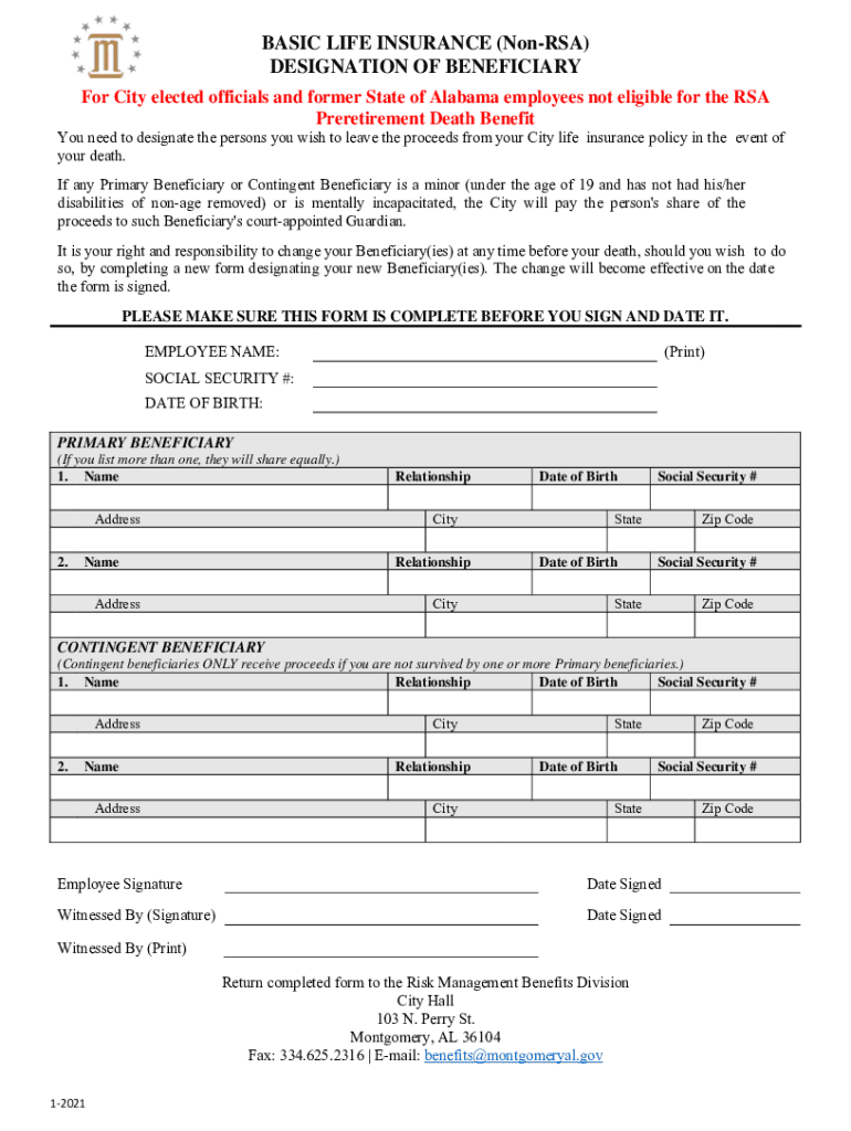 BASIC LIFE INSURANCE (NonRSA) DESIGNATION OF BENEFICIARY For City elected officials and former State of Alabama employees not eligible for the RSA Retirement Death Benefit need to designate the persons