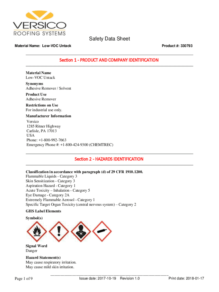 Safety Data Sheet Material Name: Low VOC UntackProduct #: 330793Section 1 PRODUCT AND COMPANY IDENTIFICATION Material Name Low VOC Unpack Synonyms Adhesive Remover / Solvent Product Use Adhesive Remover