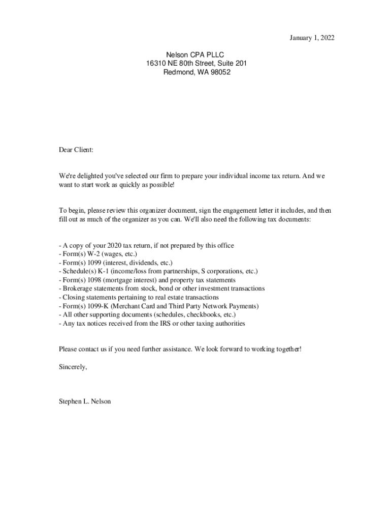 January 1, 2022, Nelson CPA LLC 16310 NE 80th Street, Suite 201 Redmond, WA 98052Dear Client: We\'re delighted you\'ve selected our firm to prepare your individual income tax return. And we want to