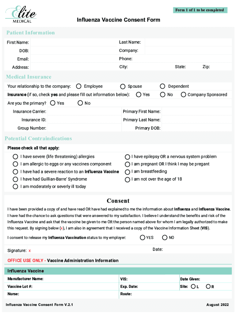 Form 1 of 1 to be completedInfluenza Vaccine Consent Form Patient Information Last Name:First Name:Company:DOB:Phone:Email:City:Address:State:Zip:Medical Insurance Your relationship to the company:EmployeeSpouseInsurance