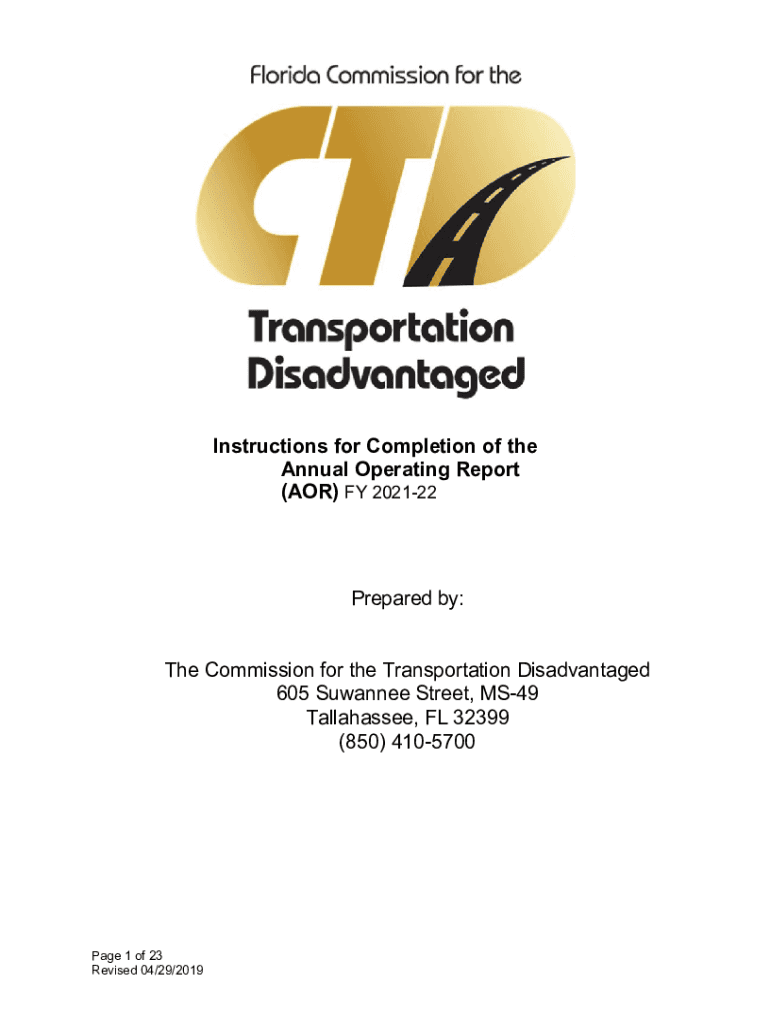 Instructions for Completion of the Annual Operating Report (AOR) FY 202122Prepared by: The Commission for the Transportation Disadvantaged 605 Suwanee Street, MS49 Tallahassee, FL 32399 (850) 4105700Page