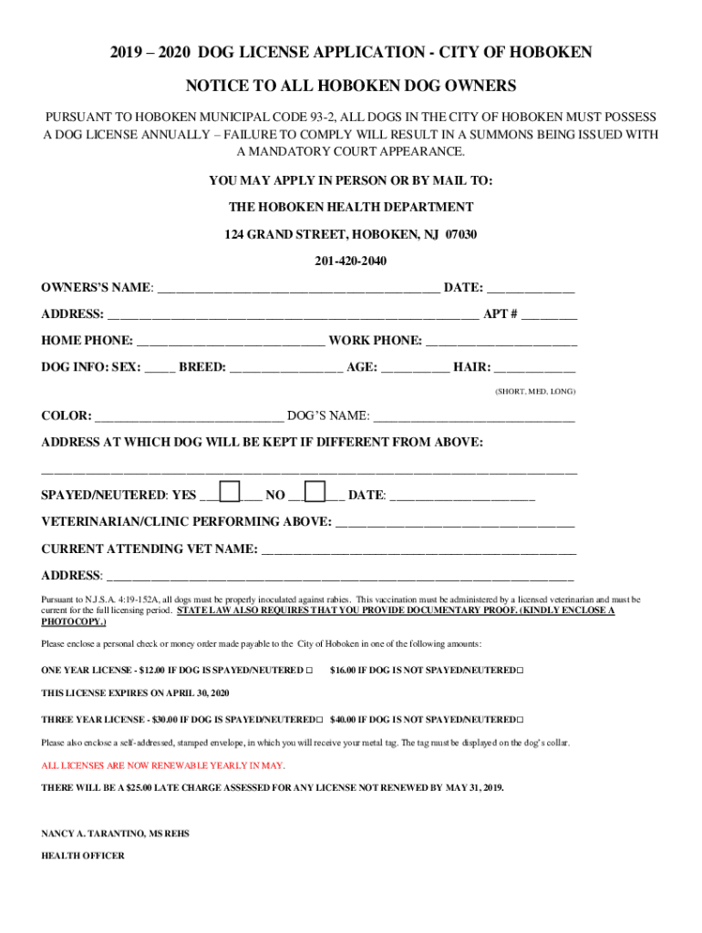 2019 2020 DOG LICENSE APPLICATION CITY OF HOBOKEN NOTICE TO ALL HOBOKEN DOG OWNERS PURSUANT TO HOBOKEN MUNICIPAL CODE 932, ALL DOGS IN THE CITY OF HOBOKEN MUST POSSESS A DOG LICENSE ANNUALLY FAILURE