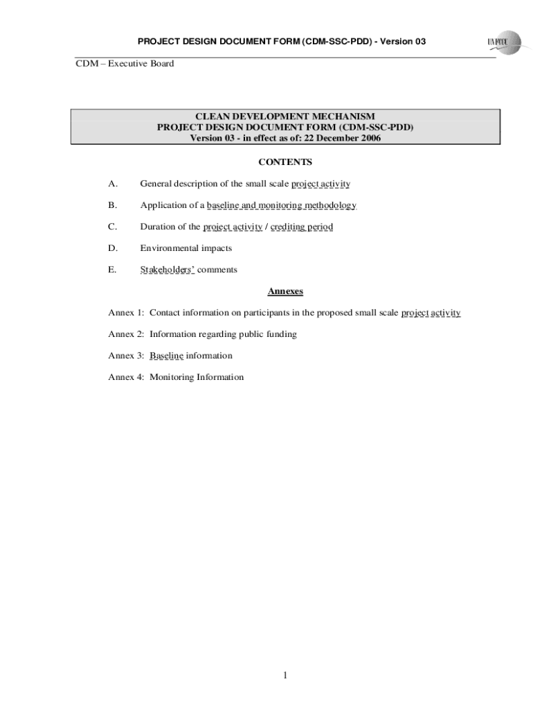 PROJECT DESIGN DOCUMENT FORM (CDMSSCPDD) Version 03CDM Executive Boardman DEVELOPMENT MECHANISM PROJECT DESIGN DOCUMENT FORM (CDMSSCPDD) Version 03 in effect as of: 22 December 2006 CONTENTS A. General