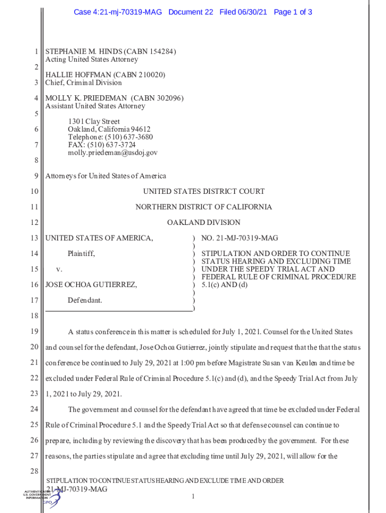 Case 4:21mj70319MAG Document 22 Filed 06/30/21-Page 1 of 31 STEPHANIE M. HINDS (CAN 154284) Acting United States Attorney 2 HALLIE HOFFMAN (CAN 210020) 3 Chief, Criminal Division 4 MOLLY K. FRIEDMAN