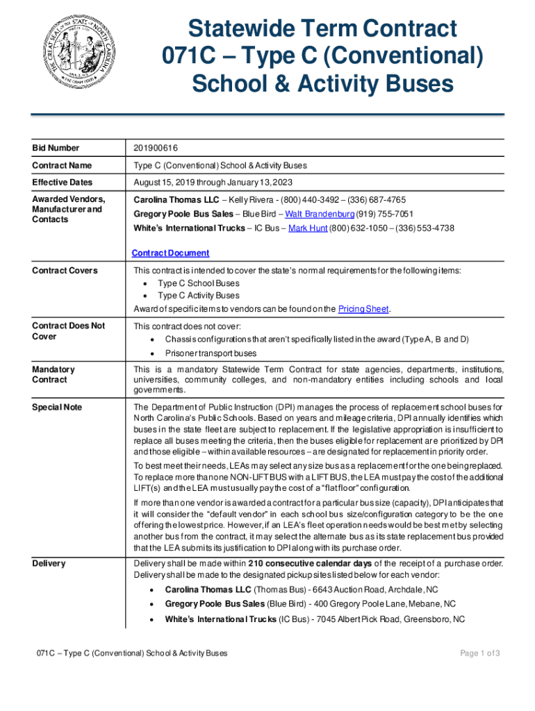 Statewide Term Contract 071C Type C (Conventional) School & Activity Buses Bid Number201900616Contract Namely C (Conventional) School & Activity BusesEffective Dates August 15, 2019, through January
