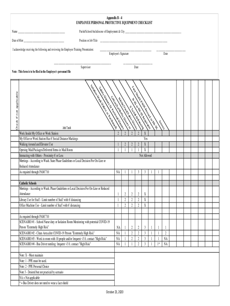 Appendix B 4 EMPLOYEE PERSONAL PROTECTIVE EQUIPMENT CHECKLIST Name ___Parish/School/Archdiocese of Employment & City ___Date of Hire ___Position or Job Title acknowledge receiving the following and