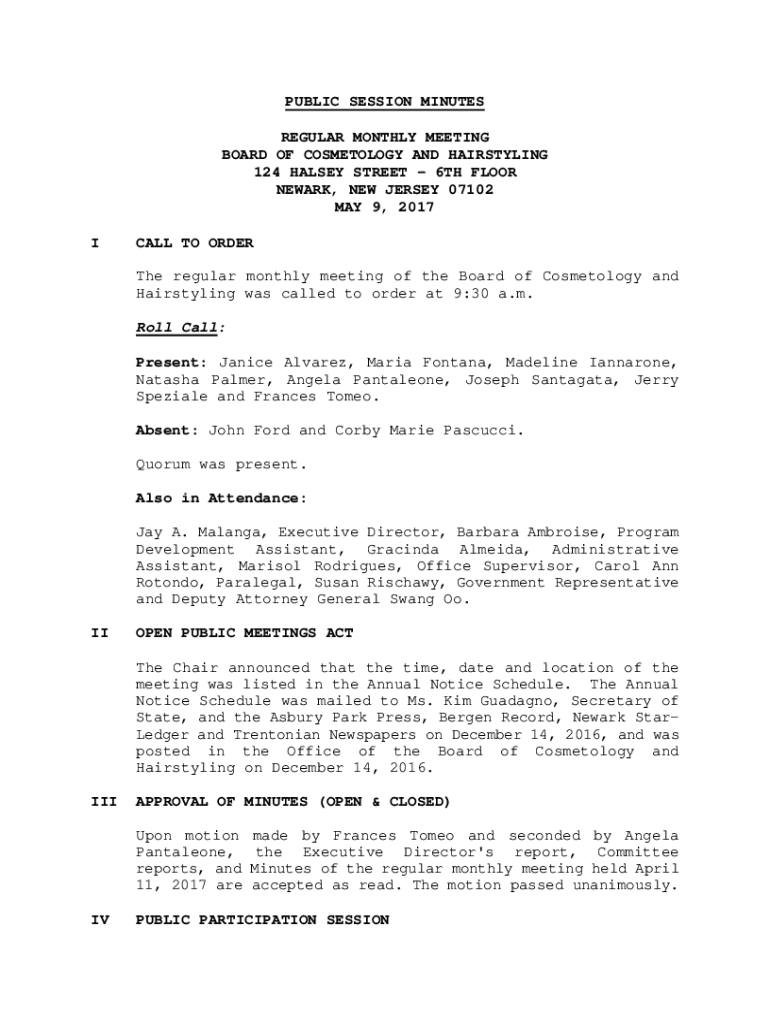 PUBLIC SESSION MINUTES REGULAR MONTHLY MEETING BOARD OF COSMETOLOGY AND HAIRSTYLING 124 HALSEY STREET 6TH FLOOR NEWARK, NEW JERSEY 07102 MAY 9, 2017, CALL TO ORDER The regular monthly meeting of the