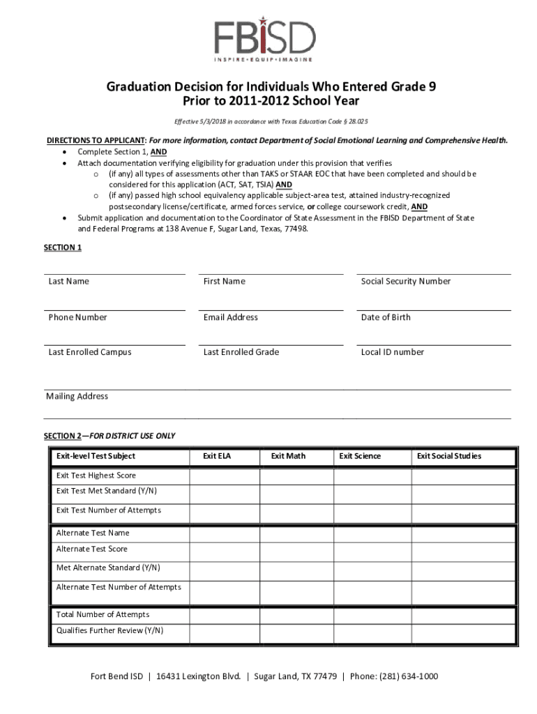 Graduation Decision for Individuals Who Entered Grade 9 Prior to 20112012 School Year Effective 5/3/2018 in accordance with Texas Education Code 28.025DIRECTIONS TO APPLICANT: For more information,