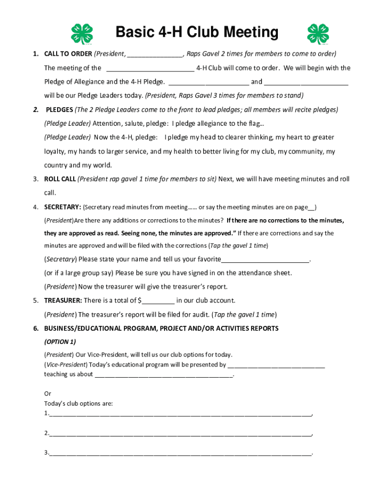Basic 4H Club Meeting 1. CALL TO ORDER (President, ___, Raps Gavel 2 times for members to come to order) The meeting of the ___ 4H Club will come to order. We will begin with the Pledge of Allegiance