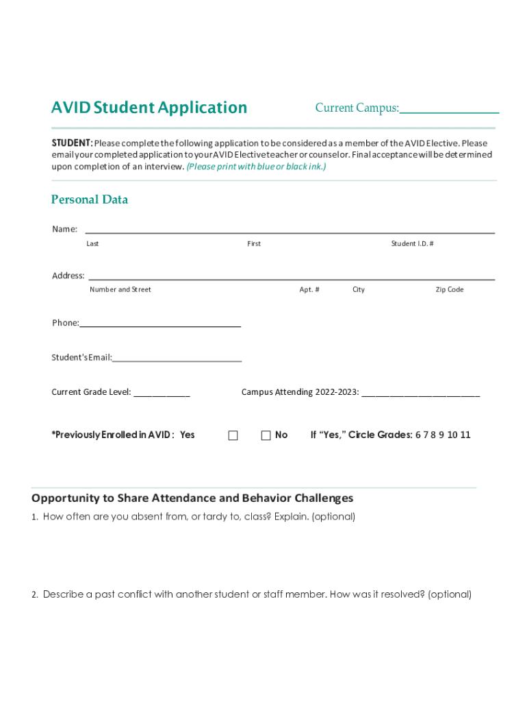 AVID Student ApplicationCurrent Campus:STUDENT: Please complete the following application to be considered as a member of the AVID Elective. Please email your completed application to your AVID Elective