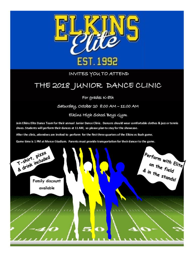 INVITES YOU TO ATTENDEE 2018 JUNIOR DANCE CLINIC For grades K8thSaturday, October 20 8:00 AM 11:00 AM Elkins High School Boys Gym Join Elkins Elite Dance Team for their annual Junior Dance Clinic.