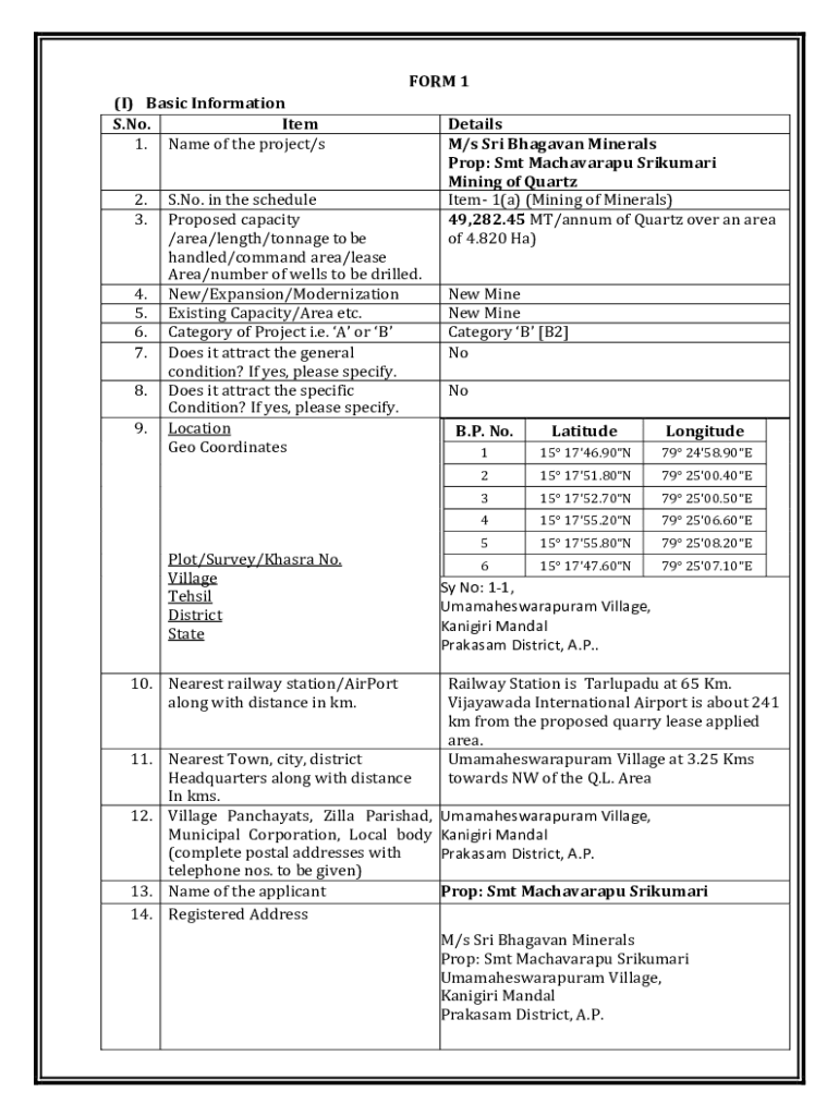 FORM 1 (I) Basic Information S. No. Item 1. Name of the project/s 2. 3.4. 5. 6. 7. 8. 9. S. No. in the schedule Proposed capacity /area/length/tonnage to be handled/command area/lease Area/number
