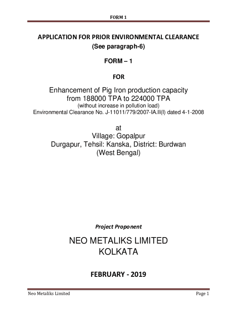 FORM 1APPLICATION FOR PRIOR ENVIRONMENTAL CLEARANCE (See paragraph6) FORM 1FOR Enhancement of Pig Iron production capacity from 188000 TPAs to 224000 TPA (without increase in pollution load) Environmental