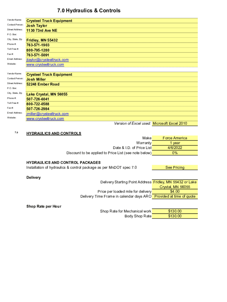 7.0 Hydraulics & Controls Vendor Name: Contact Person: Street Address: P.O. Box: City, State, Zip Phone #: Toll Free #: Fax #: Email Address: Website:Vendor Name: Contact Person: Street Address: P.O.