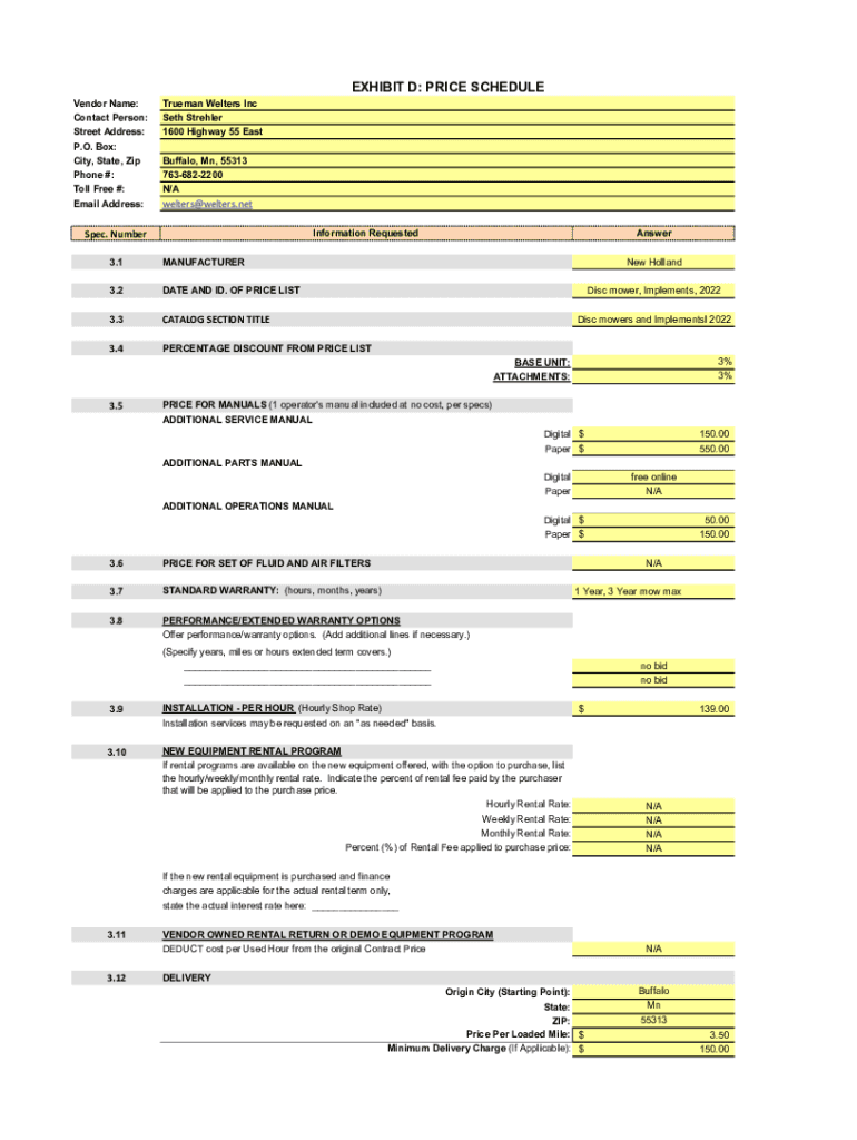 Vendor Name: Contact Person: Street Address: P.O. Box: City, State, Zip Phone #: Toll Free #: Email Address:EXHIBIT D: PRICE SCHEDULETrueman Welters Inc Seth Streamer 1600 Highway 55 East Buffalo,