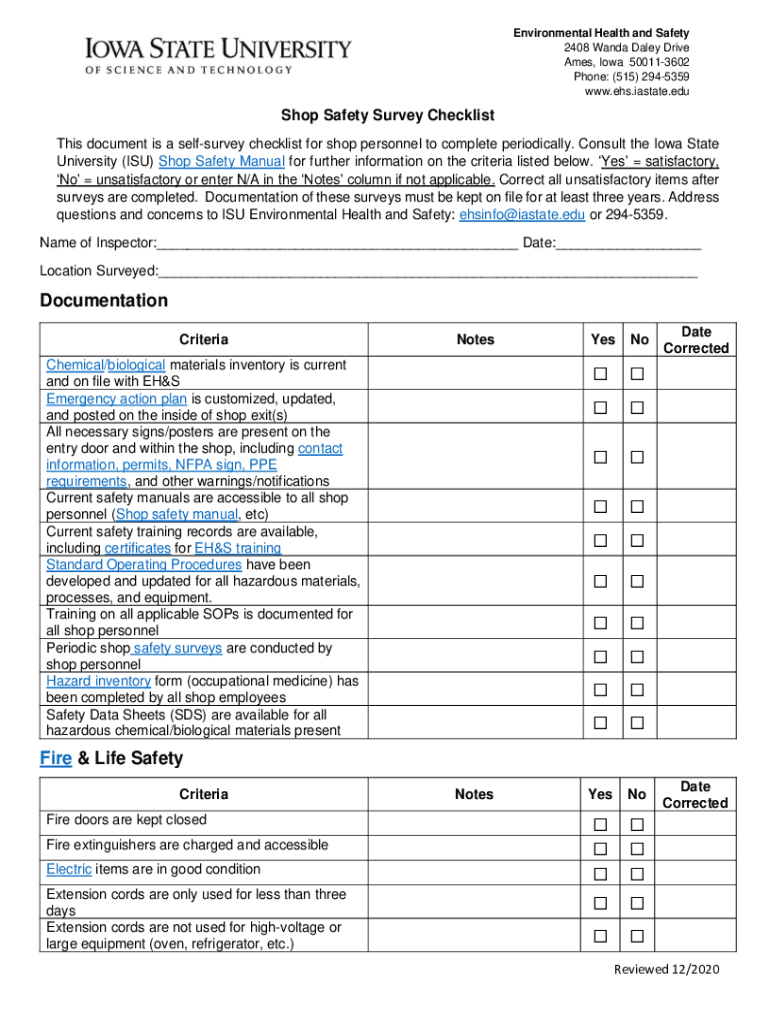 Environmental Health and Safety 2408 Wanda Daley Drive Ames, Iowa 500113602 Phone: (515) 2945359 www.ehs.iastate.eduShop Safety Survey Checklist This document is a self survey checklist for shop personnel