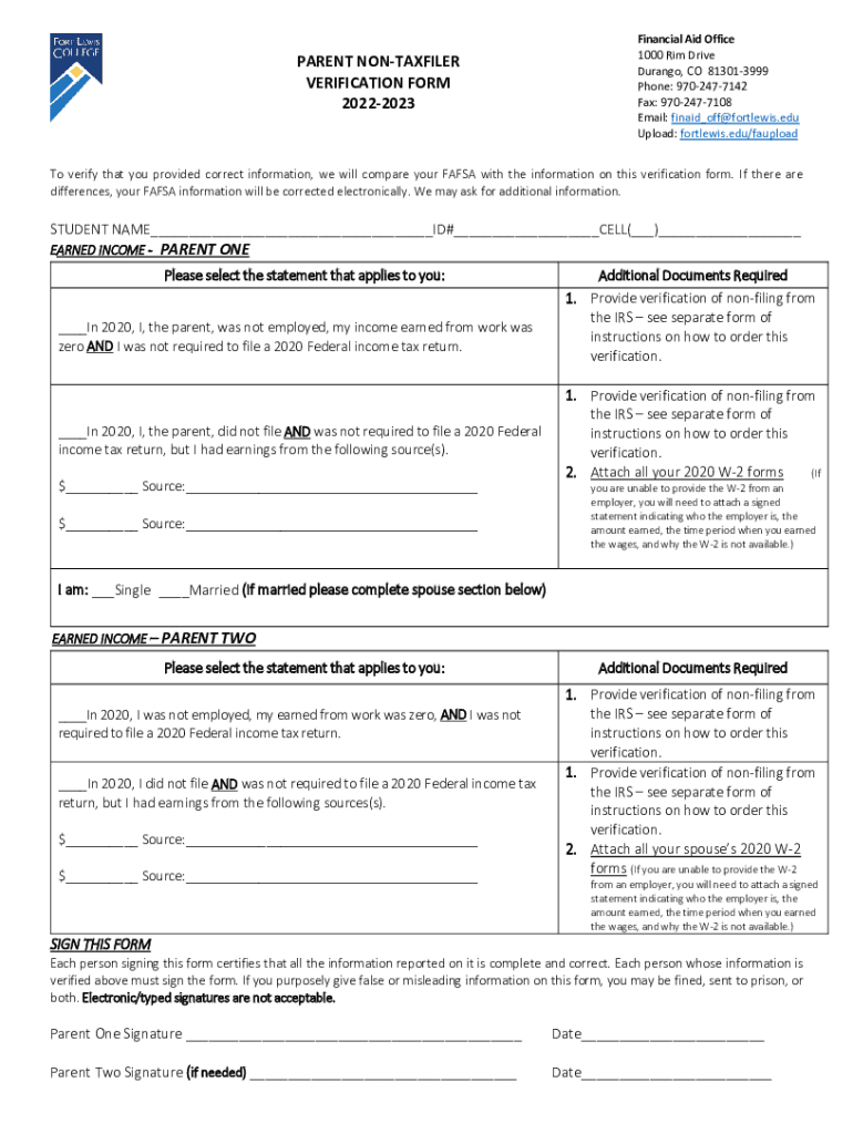 PARENT NONTAXABLE VERIFICATION FORM 20222023Financial Aid Office 1000 Rim Drive Durango, CO 813013999 Phone: 9702477142 Fax: 9702477108 Email: finaid_off@fortlewis.edu Upload: fortlewis.edu/fauploadTo