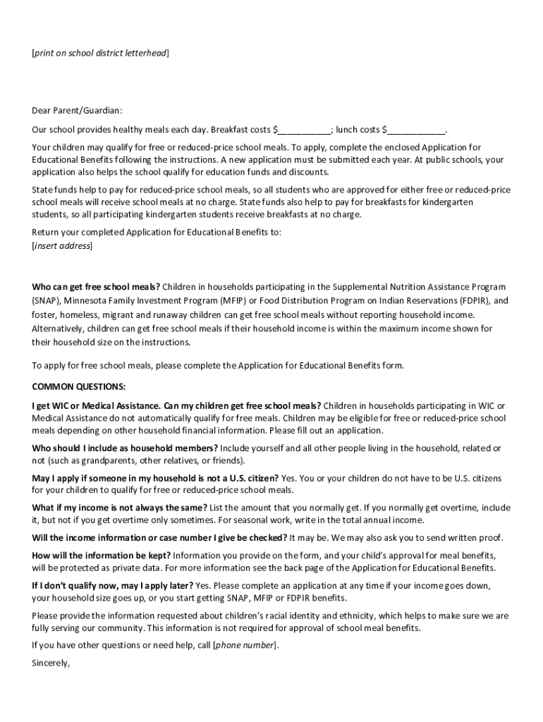 [print on school district letterhead]Dear Parent/Guardian: Our school provides healthy meals each day. Breakfast costs $___; lunch costs $___. Your children may qualify for free or reduced price school