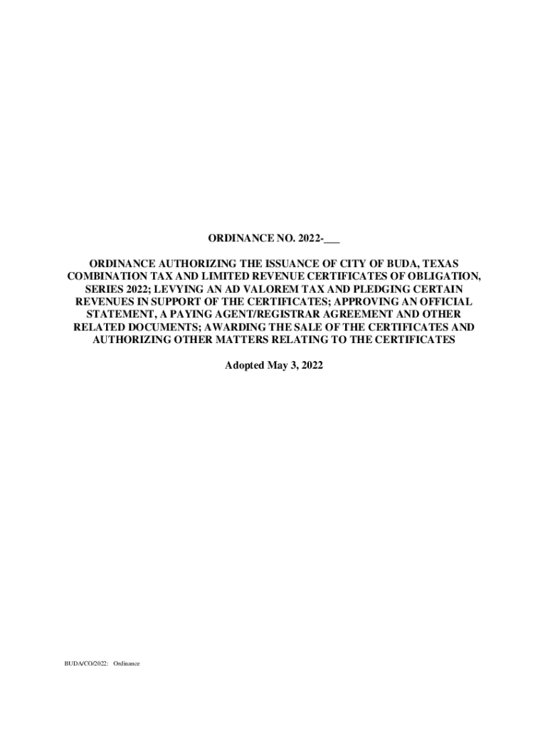 ORDINANCE NO. 2022___ ORDINANCE AUTHORIZING THE ISSUANCE OF CITY OF BUD, TEXAS COMBINATION TAX AND LIMITED REVENUE CERTIFICATES OF OBLIGATION, SERIES 2022; LEVYING AN AD VALOR EM TAX AND PLEDGING