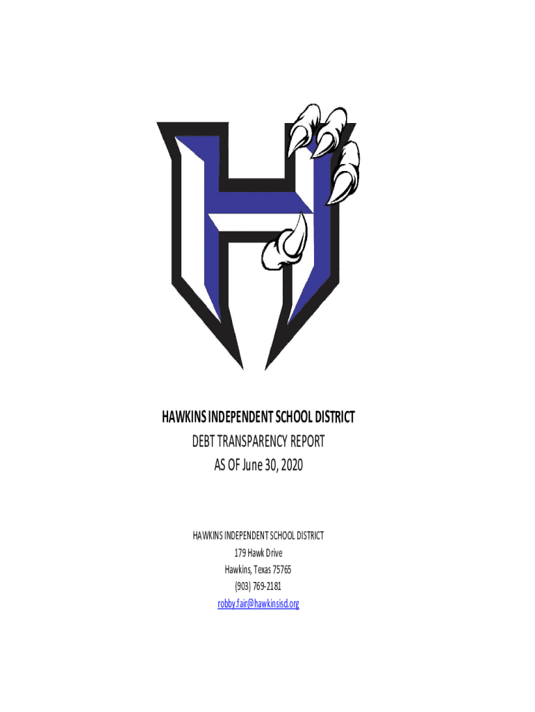 HAWKINS INDEPENDENT SCHOOL DISTRICT DEBT TRANSPARENCY REPORT AS OF June 30, 2020HAWKINS INDEPENDENT SCHOOL DISTRICT 179 Hawk Drive Hawkins, Texas 75765 (903) 7692181 robby.fair@hawkinsisd.orgTexas