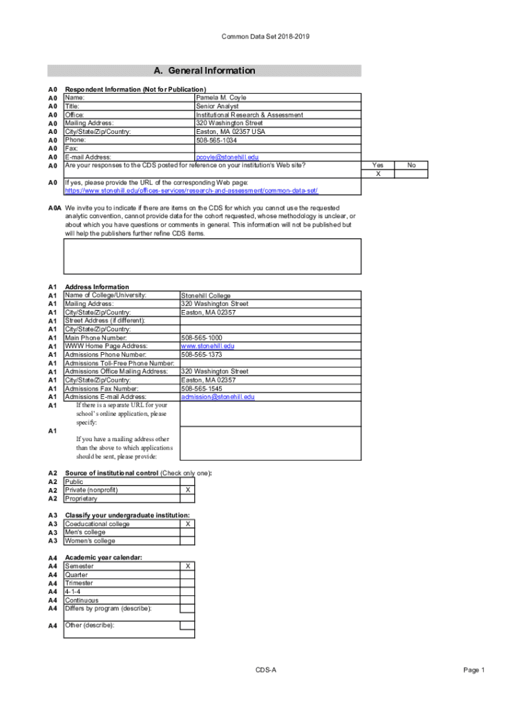 Common Data Set 20182019A. General Information A0 A0 A0 A0 A0 A0 A0 A0 A0 A0Respondent Information (Not for Publication) Name: Pamela M. Coyle Title: Senior Analyst Office: Institutional Research