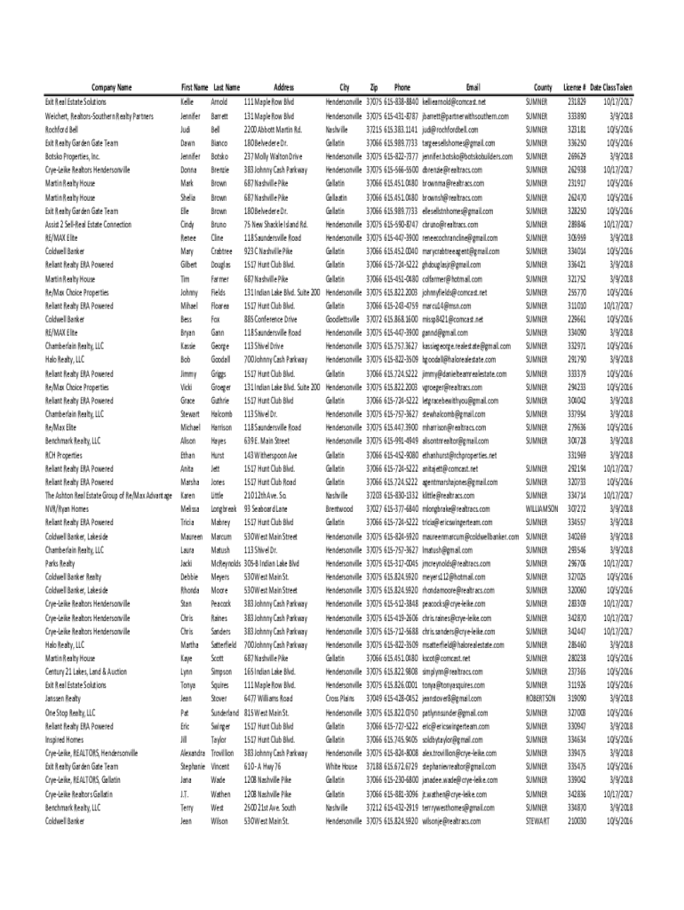Company Name Exit Real Estate Solutions Wei chert, RealtorsSouthern Realty Partners Rochford Bell Exit Realty Garden Gate Team Bots Properties, Inc. Treelike Realtors Hendersonville Martin Realty
