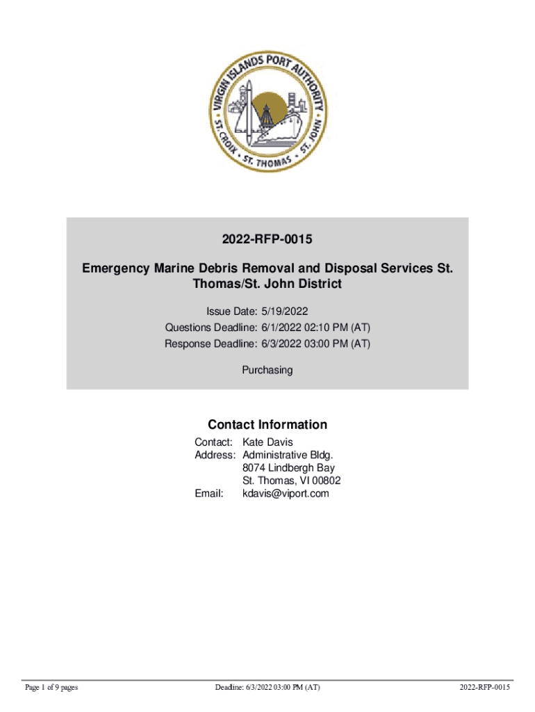 2022RFP0015 Emergency Marine Debris Removal and Disposal Services St. Thomas/St. John District Issue Date: 5/19/2022 Questions Deadline: 6/1/2022 02:10 PM (AT) Response Deadline: 6/3/2022 03:00 PM