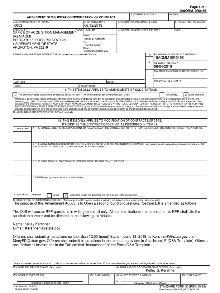 Page 1 of 1 19AQMM19R0156 1. CONTRACT ID CODERATINGAMENDMENT OF SOLICITATION/MODIFICATION OF CONTRACT 2. AMENDMENT/MODIFICATION NO.3. EFFECTIVE DATE00034. REQUISITION/PURCHASE REQ. NO.5. PROJECT NO.