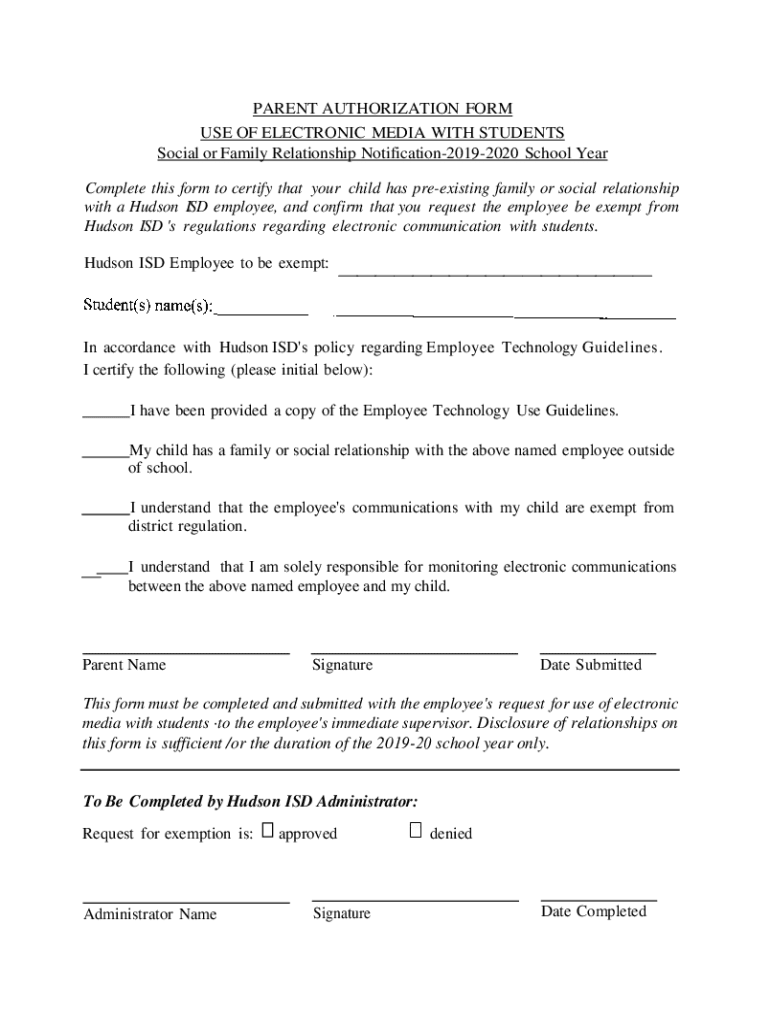 PARENT AUTHORIZATION FORM USE OF ELECTRONIC MEDIA WITH STUDENTS Social or Family Relationship Notification20192020 School Year Complete this form to certify that your child has preexisting family
