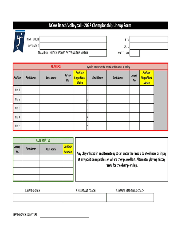 Get the free NCAA Beach Volleyball - 2022 Championship Lineup Form