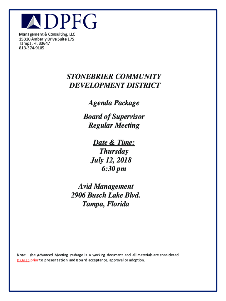 Management & Consulting, LLC 15310 Amber Drive Suite 175 Tampa, Fl. 33647 8133749105STONEBRIER COMMUNITY DEVELOPMENT DISTRICT Agenda Package Board of Supervisor Regular Meeting Date & Time: Thursday,