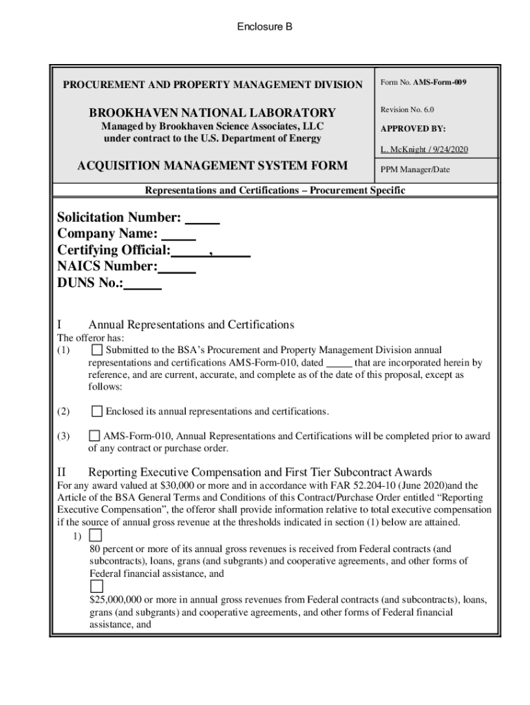 Enclosure PROCUREMENT AND PROPERTY MANAGEMENT DIVISIONBROOKHAVEN NATIONAL LABORATORY