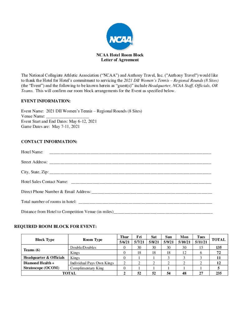 NCAA Hotel Room Block Letter of Agreement The National Collegiate Athletic Association (NCAA) and Anthony Travel, Inc. (\” Anthony Travel\”) would like to thank the Hotel for Hotels commitment