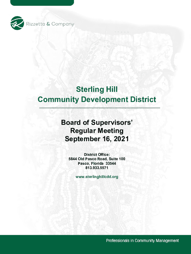 Sterling Hill Community Development District Board of Supervisors Regular Meeting September 16, 2021, District Office: 5844 Old Pasco Road, Suite 100 Pasco, Florida 33544 813.933.5571 www.sterlinghillcdd.orgSTERLING