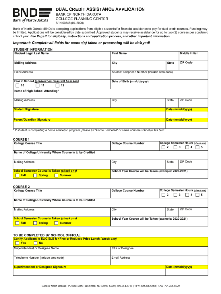 DUAL CREDIT ASSISTANCE APPLICATION BANK OF NORTH DAKOTA COLLEGE PLANNING CENTER SON 60348 (072020)Bank of North Dakota (BND) is accepting applications from eligible students for financial assistance