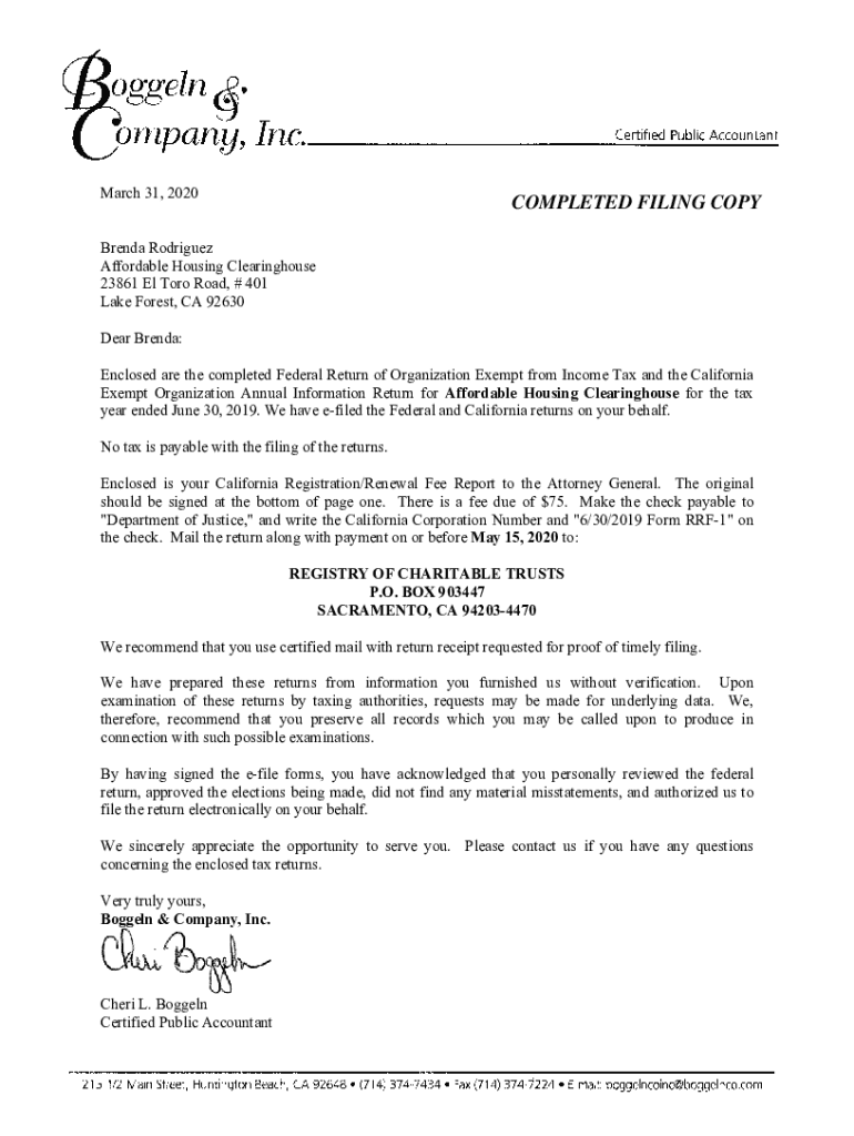 March 31, 2020COMPLETED FILING COPY Brenda Rodriguez Affordable Housing Clearinghouse 23861 El Too Road, # 401 Lake Forest, CA 92630 Dear Brenda: Enclosed are the completed Federal Return of Organization