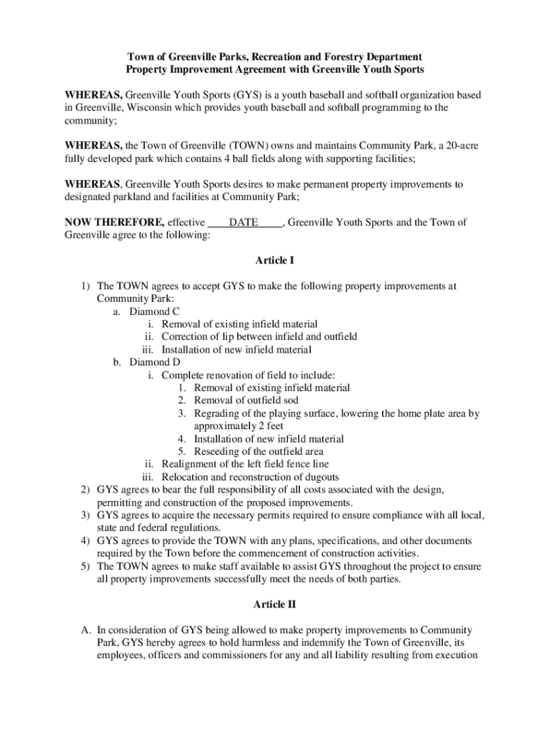 Town of Greenville Parks, Recreation and Forestry Department Property Improvement Agreement with Greenville Youth Sports WHEREAS, Greenville Youth Sports (GAS) is a youth baseball and softball organization