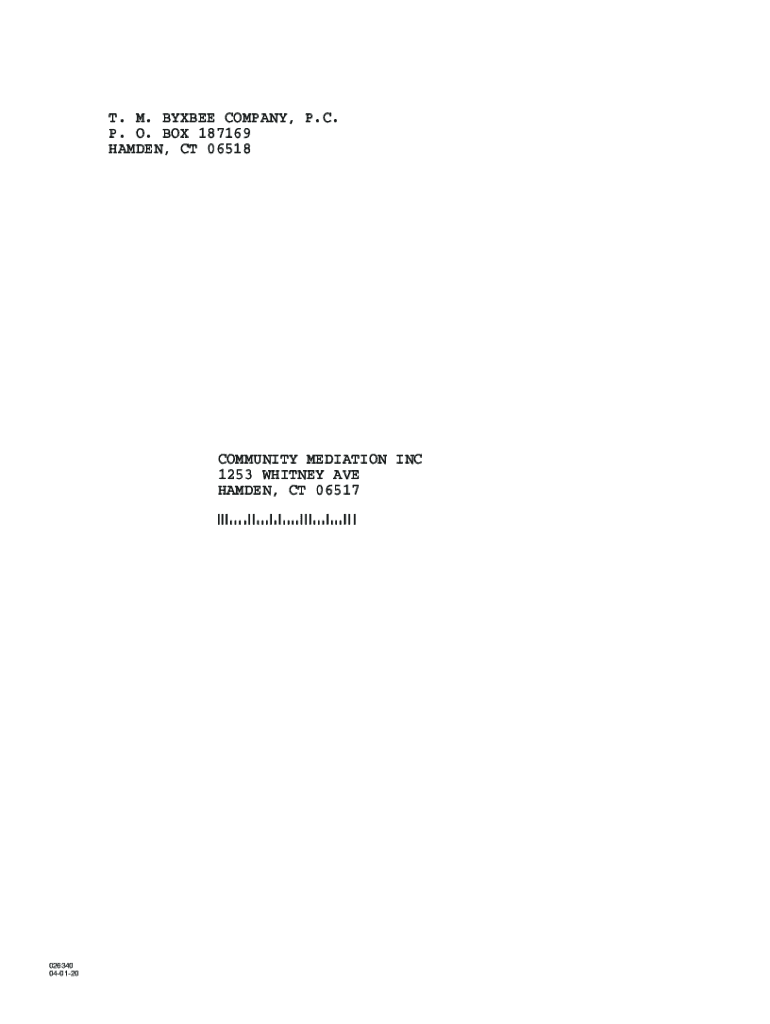 T. M. BYX BEE COMPANY, P.C. P. O. BOX 187169 HAMDEN, CT 06518COMMUNITY MEDIATION INC 1253 WHITNEY AVE HAMDEN, CT 06517!065171!026340 040120CLIENT\'S COPY August 11, 2021, Community Mediation Inc 1253