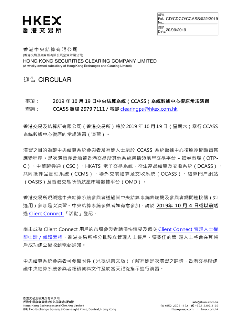 Ref. No.:CD/CDC/CLASS/022/2019 Date:20/09/2019 ()HONG KONG SECURITIES CLEARING COMPANY LIMITED (A wholly owned subsidiary of Hong Kong Exchanges and Clearing Limited) CIRCULAR 2019 10 19 CCASSCCASS